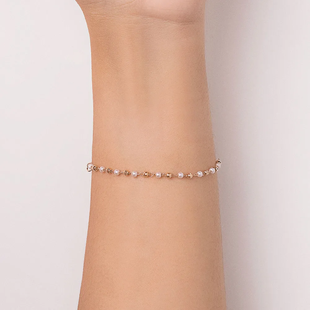 Pulseira infantil composta por 11 pérolas sintéticas de 3mm alternadas por 12 esferas diamantadas de 2,65 mm. (a quantidade de pérolas pode variar)